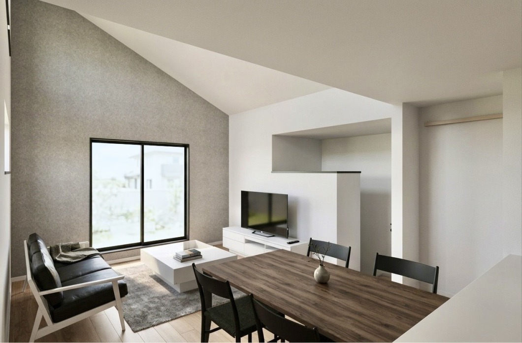 17.7帖のLDKは勾配天井とオープンキッチンでより開放的な空間を楽しめる仕様。