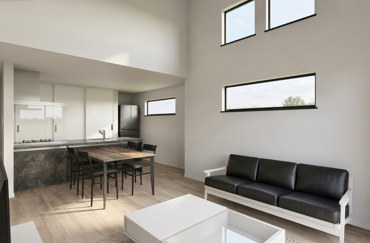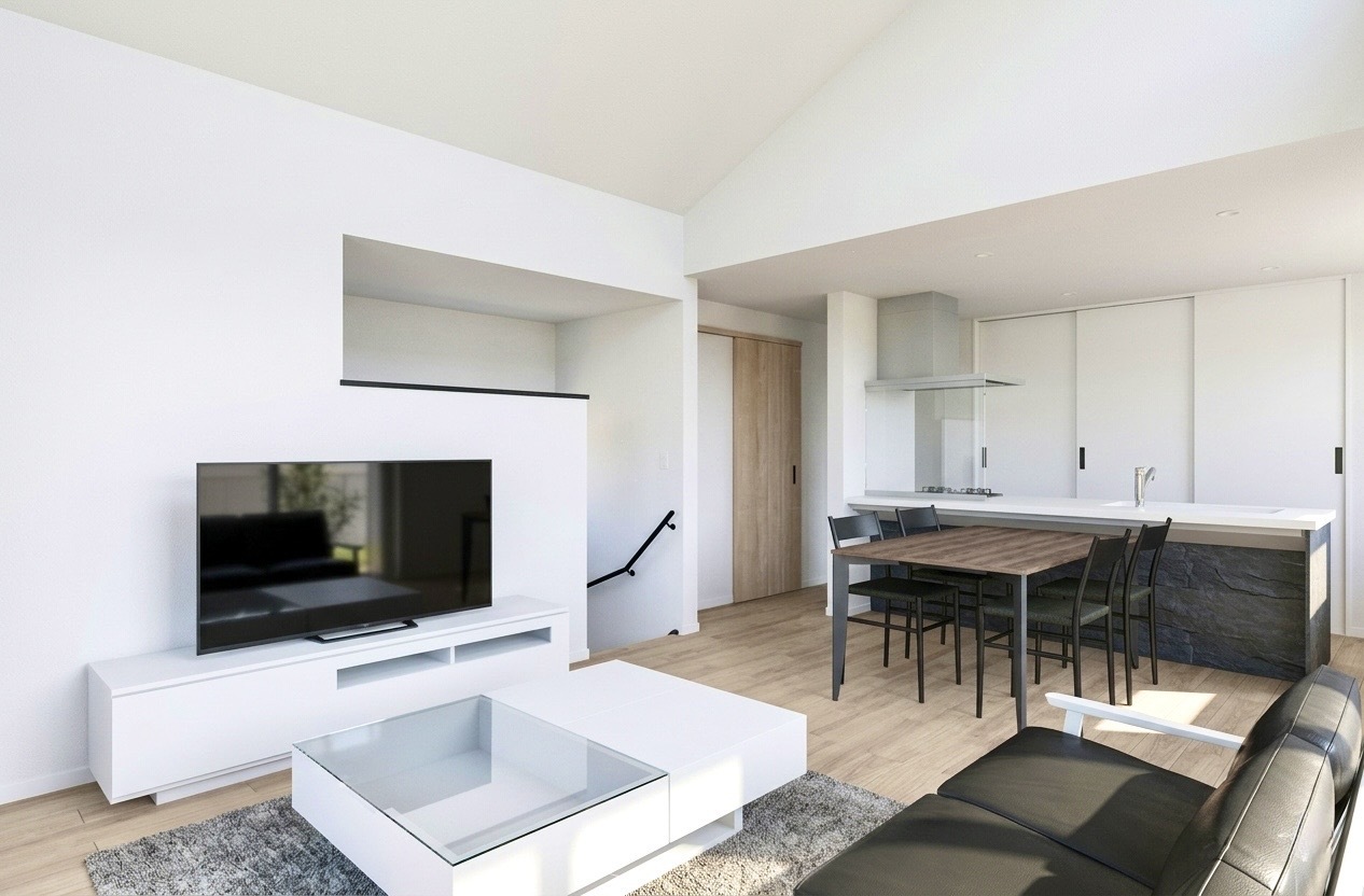 プライバシーが確保された2階リビング仕様。勾配天井とアイランドキッチンが開放感溢れる空間を創り出します。