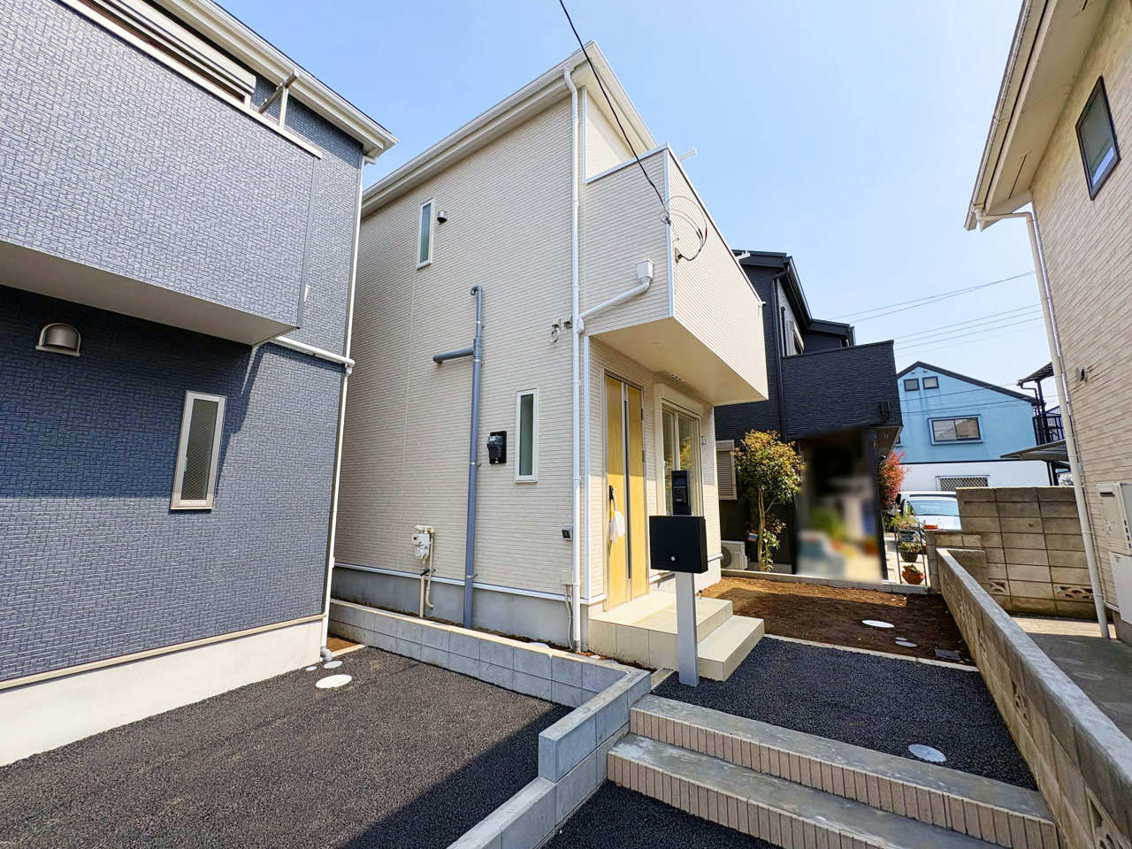 【外観】 澄み渡る青空の下、清潔感あふれる外観が際立つ住まい。穏やかな日々がここに、静かに育まれていくような穏やかな雰囲気に包まれています。