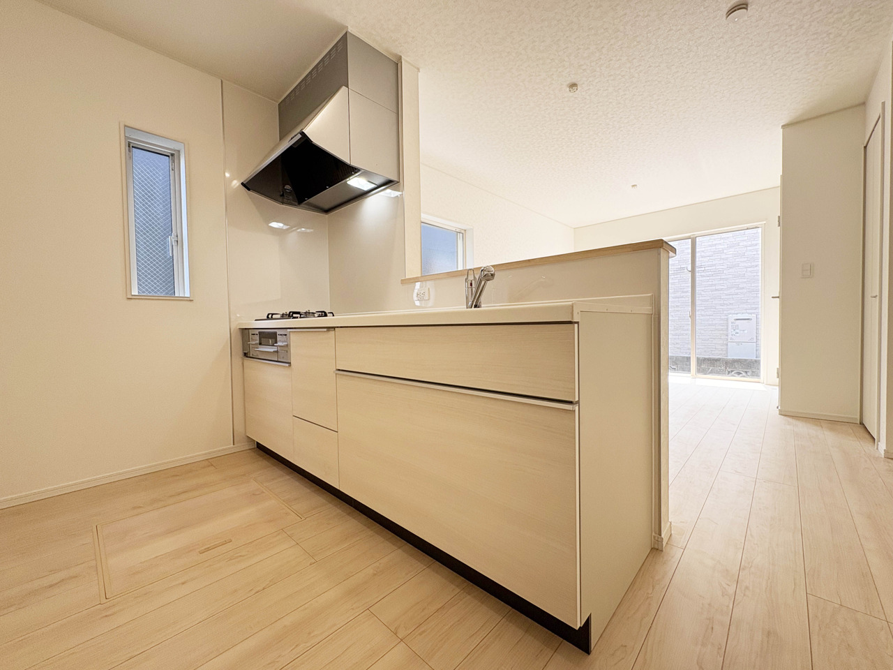 【Kitchen】 木目の温もりと洗練されたデザインが調和し、心地よい暮らしを予感させる空間。明るい床材が室内に広がりをもたらし、穏やかなひとときを演出します。