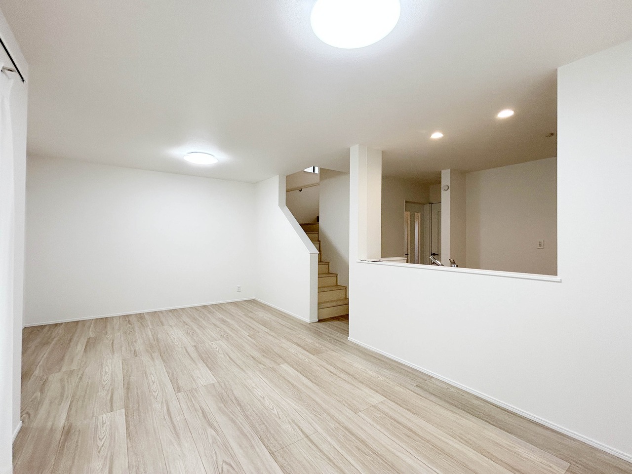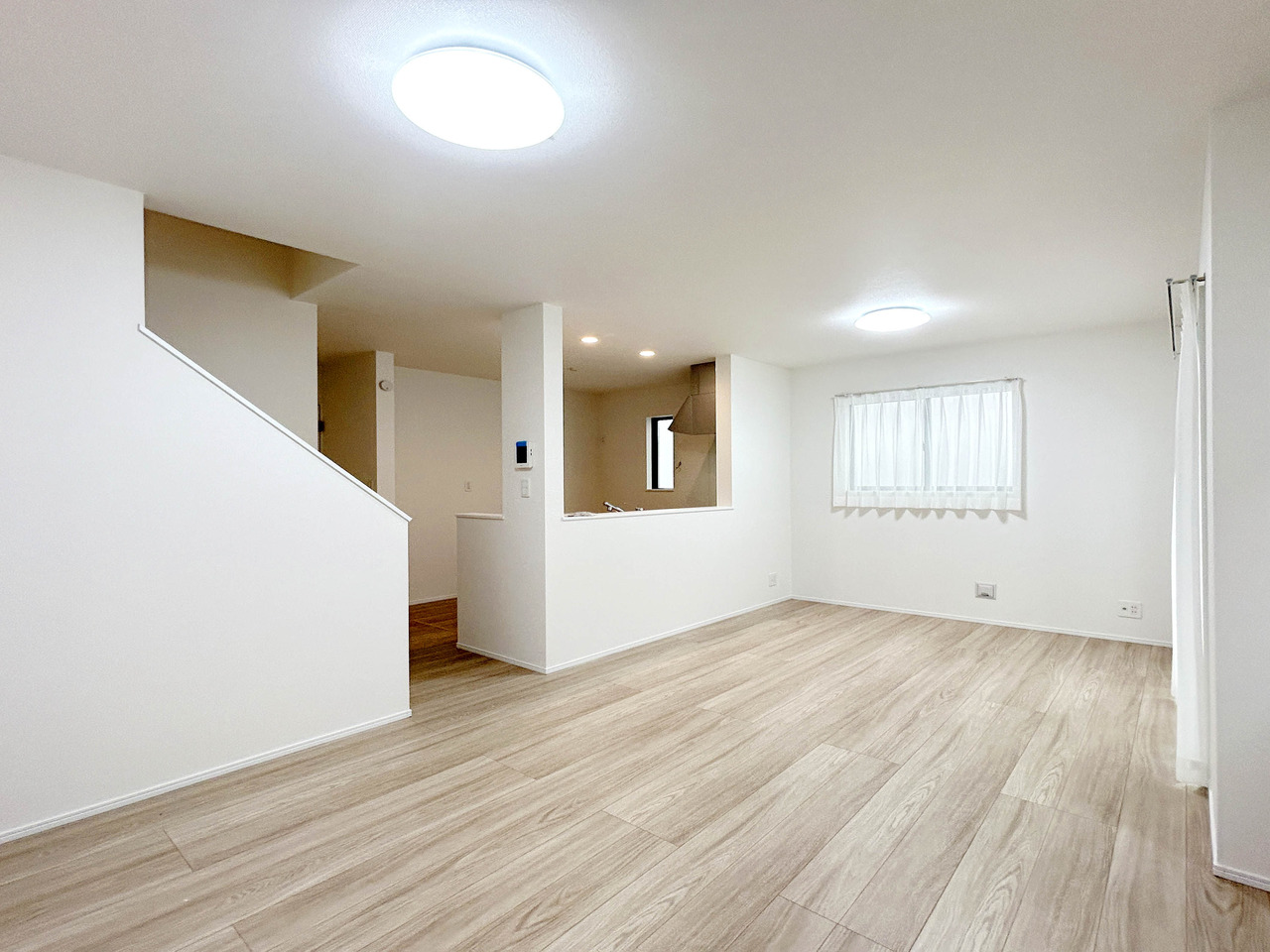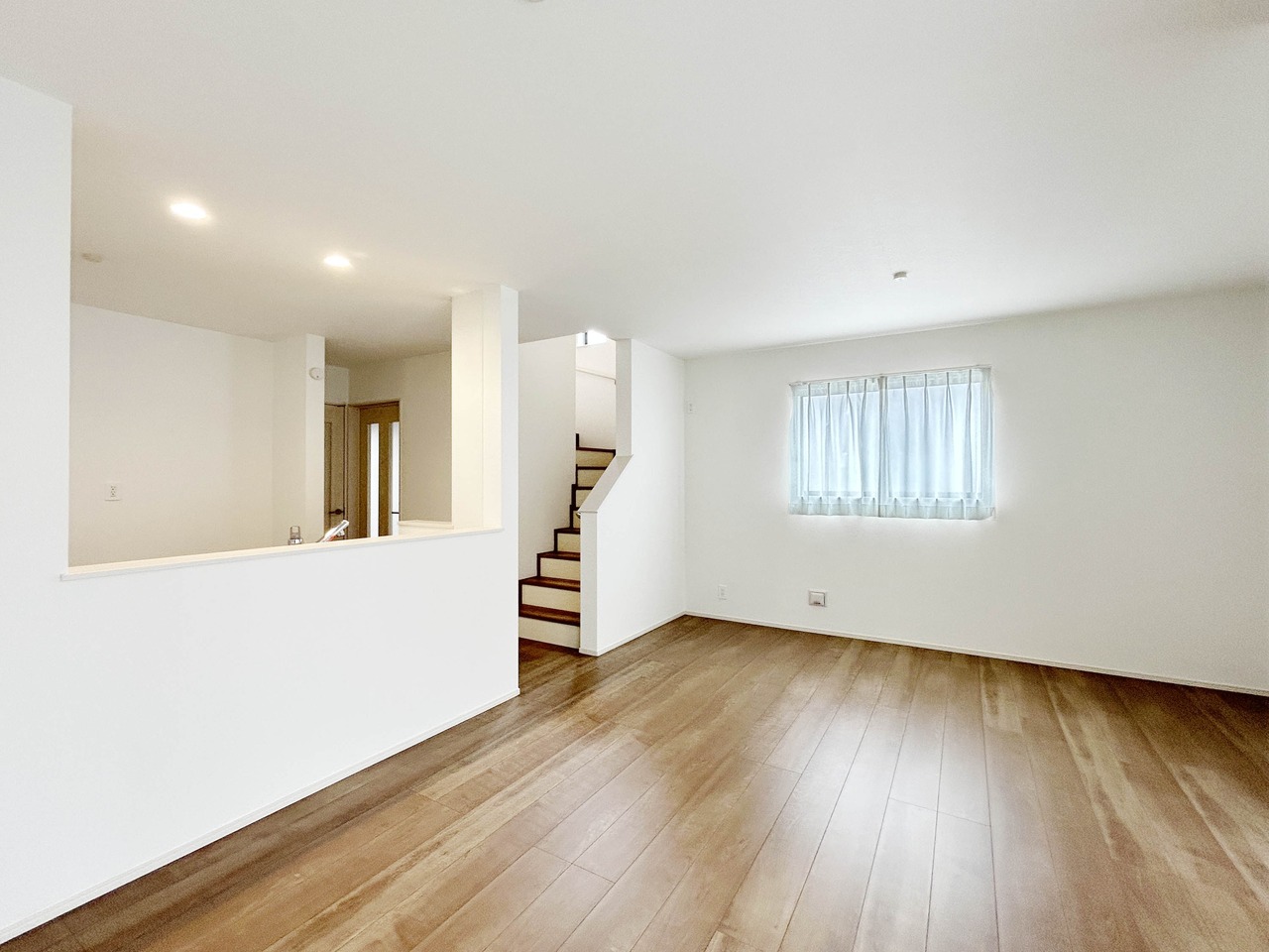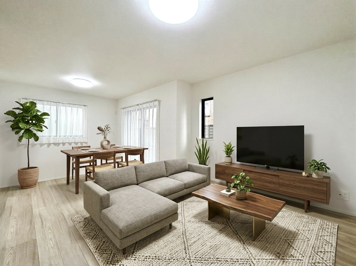 B号棟 【LDK:15帖】 木の温もりと柔らかな採光が調和する心地よい安らぎ空間。空間全体に広がる落ち着きが、日々の暮らしに穏やかな彩りをもたらします。 本画像はCGで作成しており、実際に現地に家具は配置しておりません。