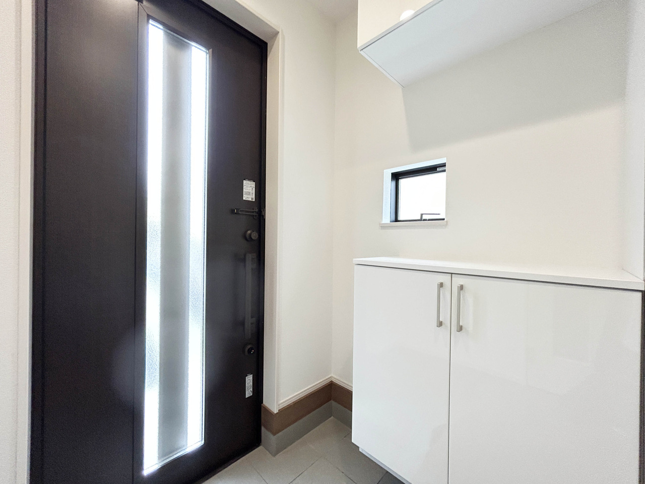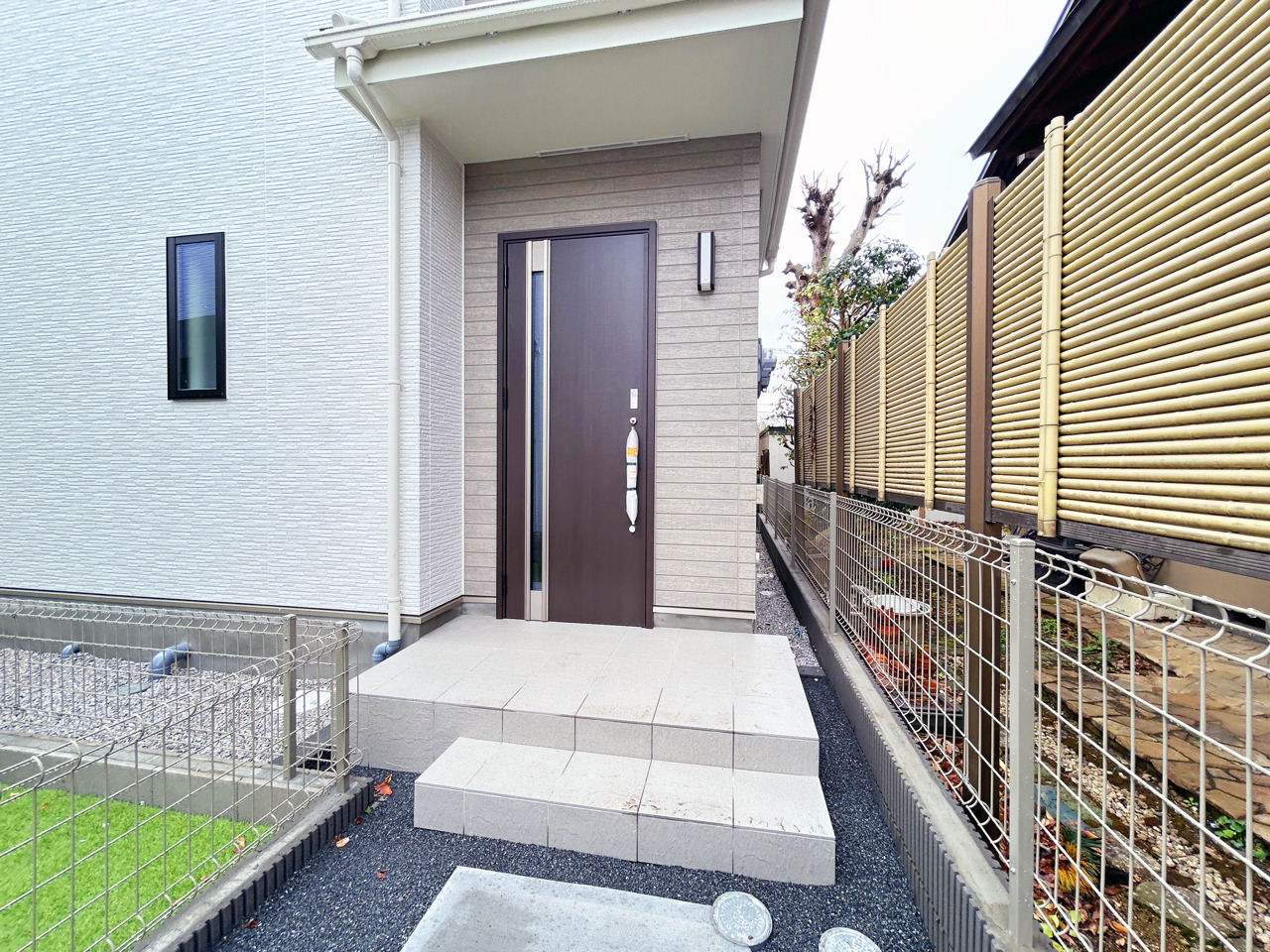 C号棟 【外観】 整然とした外観に、落ち着いた色合いの玄関ドアが訪れる人を温かく迎え入れ、都会的な暮らしに調和する住まいです。