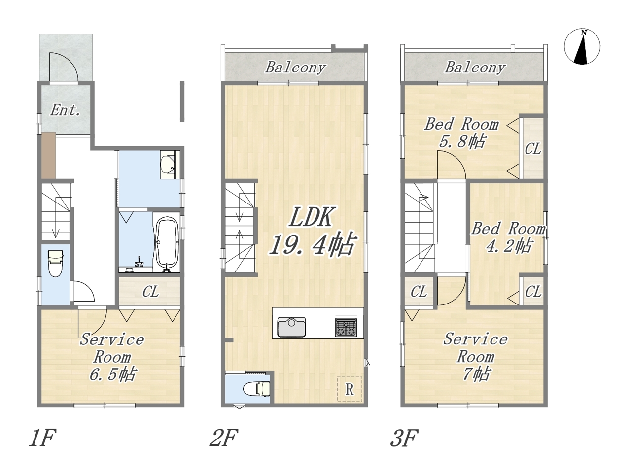 | 間取 | 2LDK+2S+ビルトインガレージ (LDK19.4帖、洋室5.8帖、洋室4.2帖、S7帖、S6.5帖) | ||