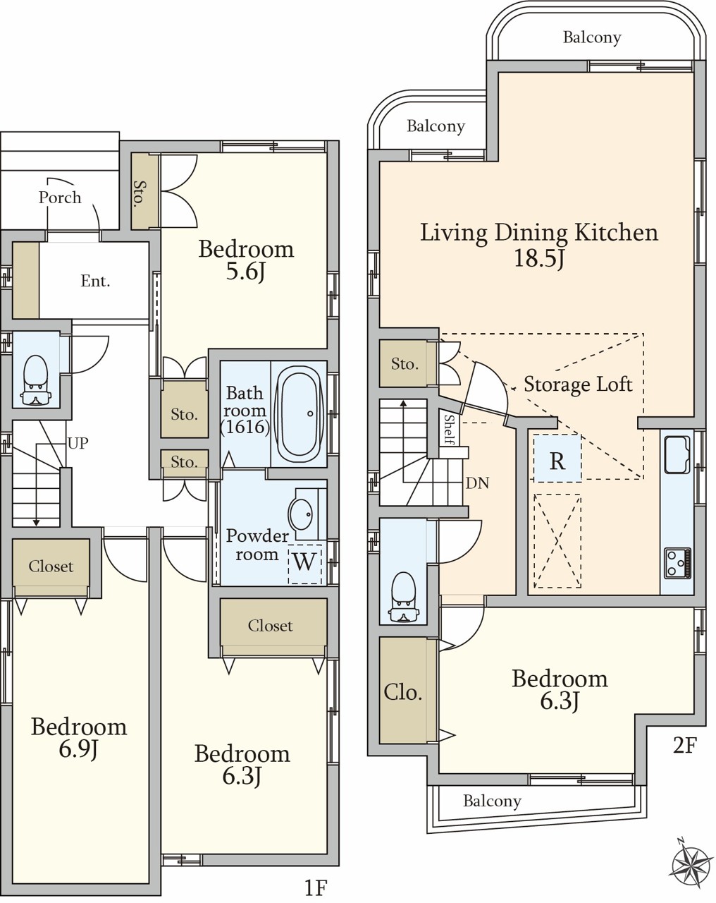 | 間取 | 4LDK+Loft+カースペース2台 (LDK18.5帖、洋室6.9帖、洋室6.3帖、洋室6.3帖、洋室5.6帖) | ||