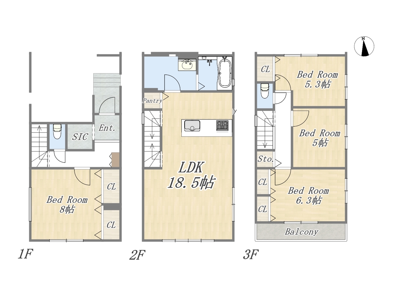 | 間取 | 4LDK + SIC+パントリー (LDK18.5帖、洋室8.0帖、洋室6.2帖、洋室5.0帖、洋室5.3帖) | ||
