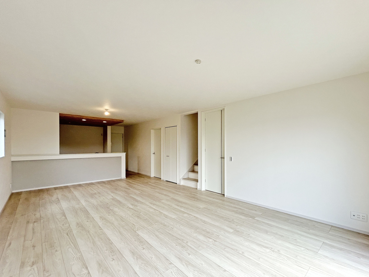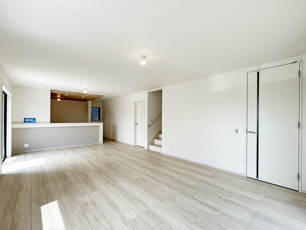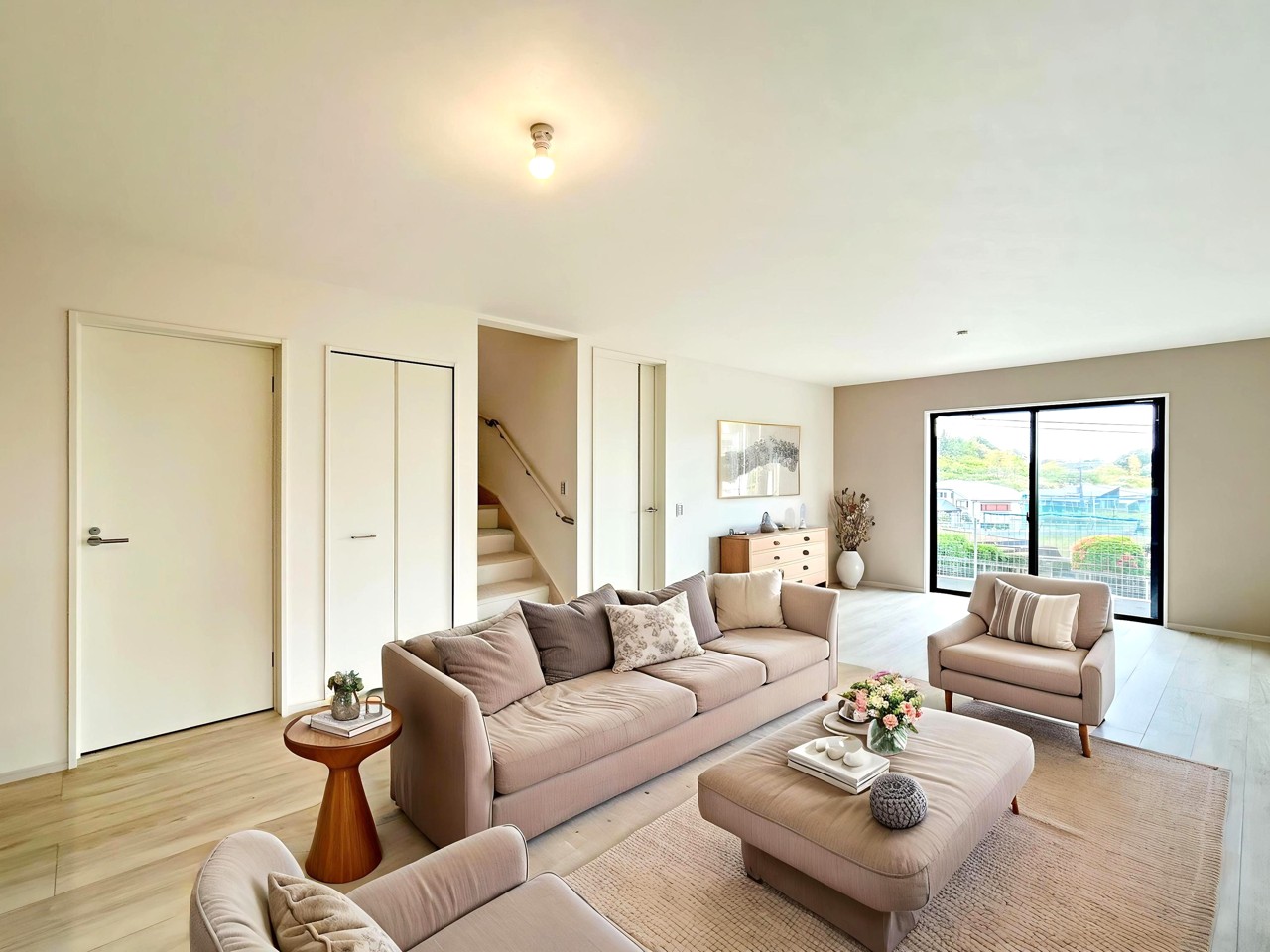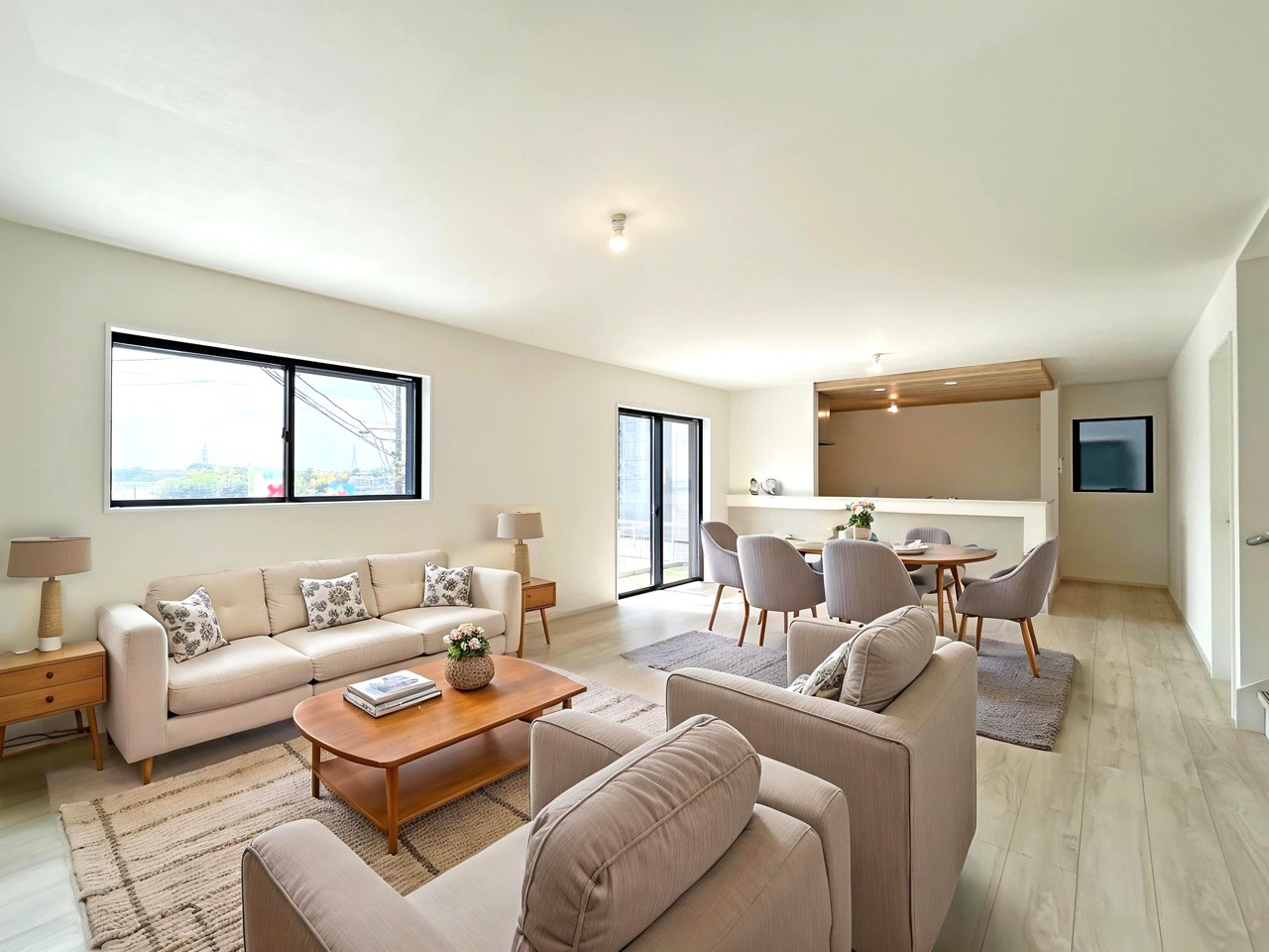 2号棟 【LDK:20帖】 穏やかな色彩が調和し、心地よい時間が流れる空間。 本画像はCGで作成しており、実際に現地に家具は配置しておりません。また、価格に家具は含まれません。