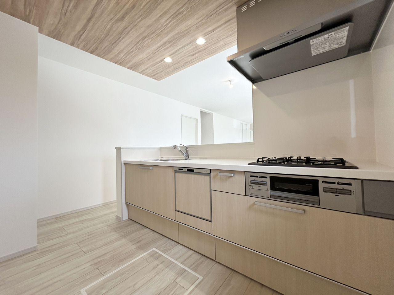 1号棟 【Kitchen】 木目調の天井が温かみと洗練された印象を与え、清潔感あふれる空間に心地よい広がりを感じさせます。