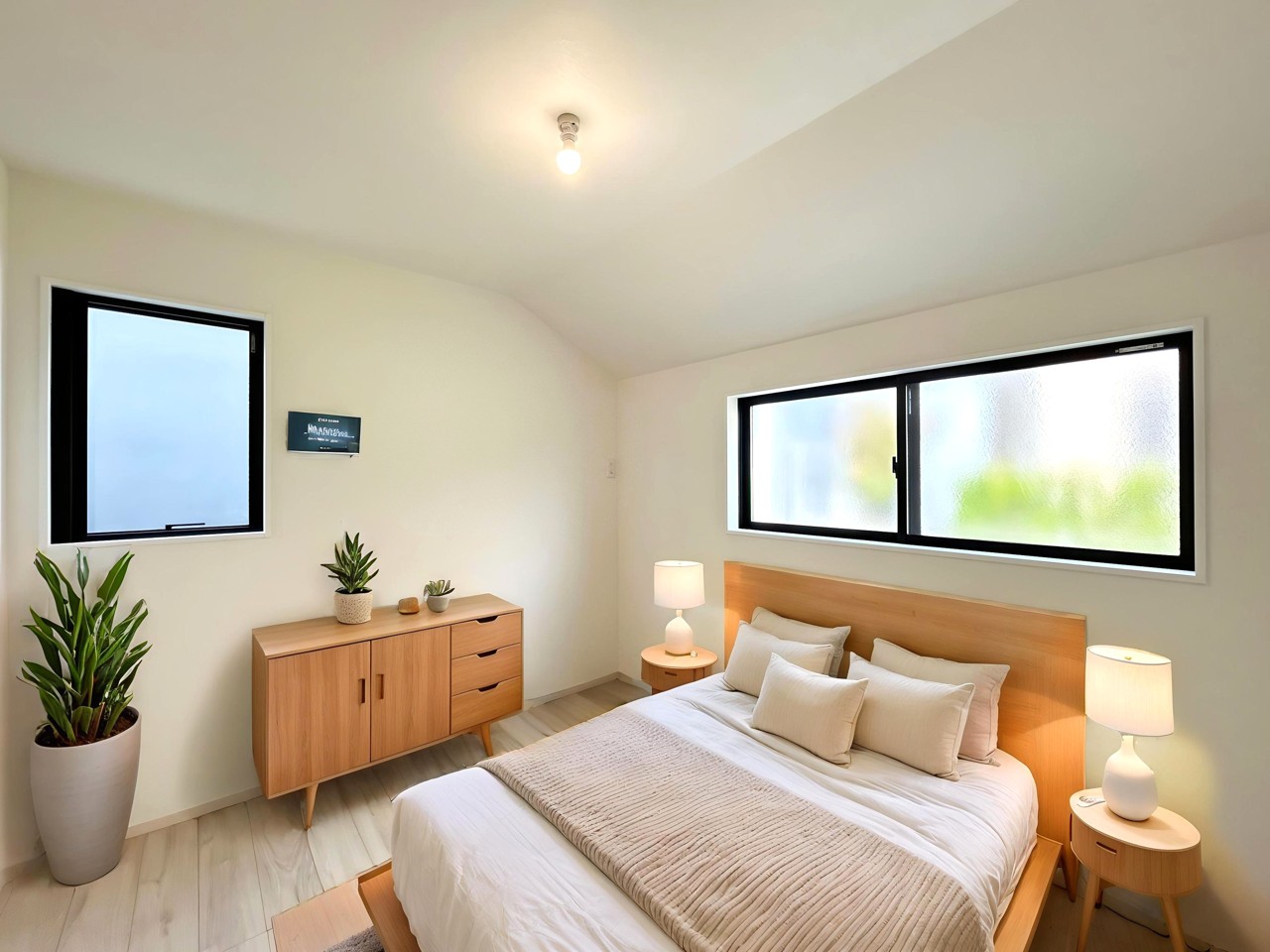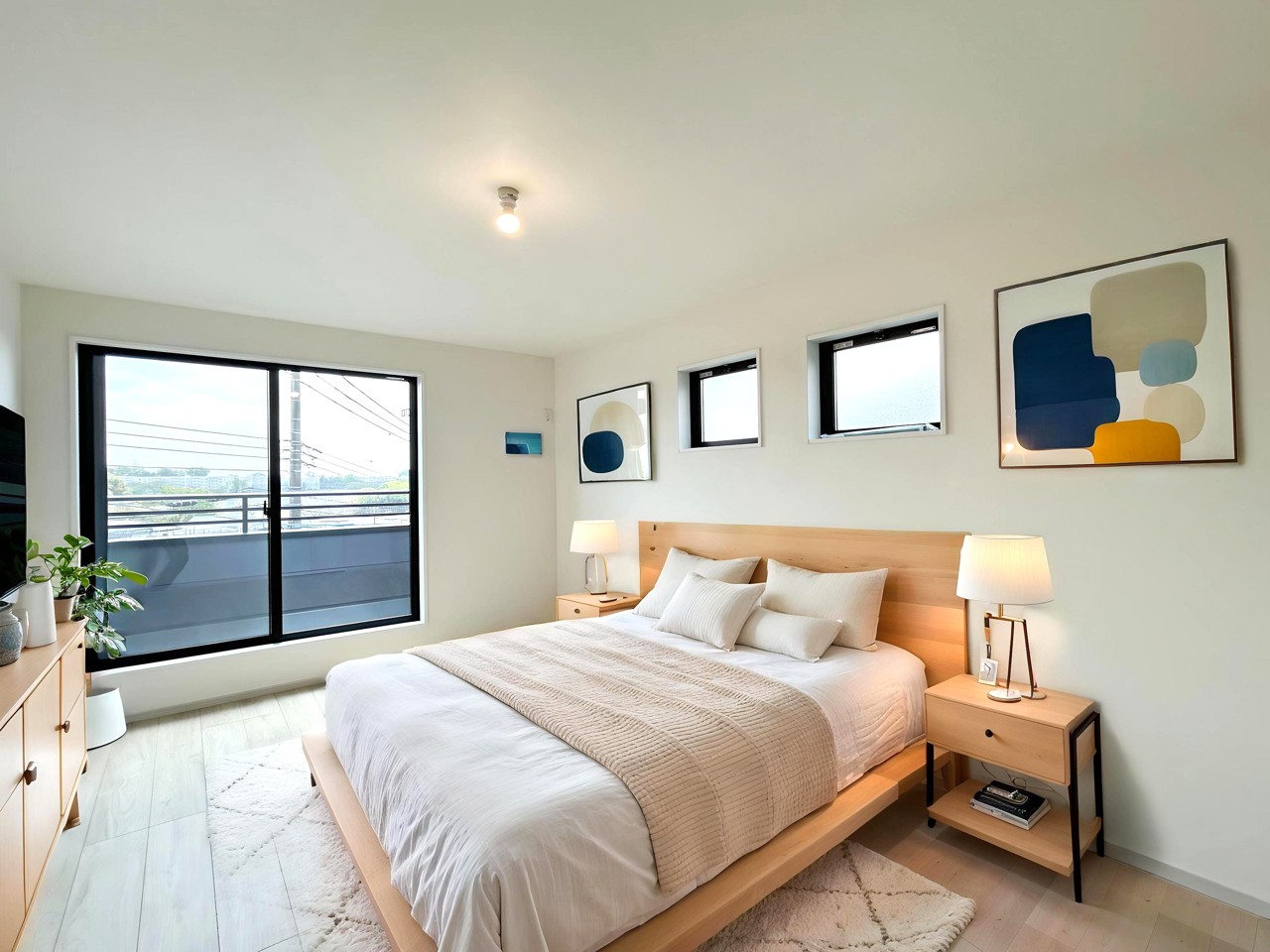 2号棟 【Room:7.5帖】 広がる空を映す、明るい室内。 本画像はCGで作成しており、実際に現地に家具は配置しておりません。また、価格に家具は含まれません。