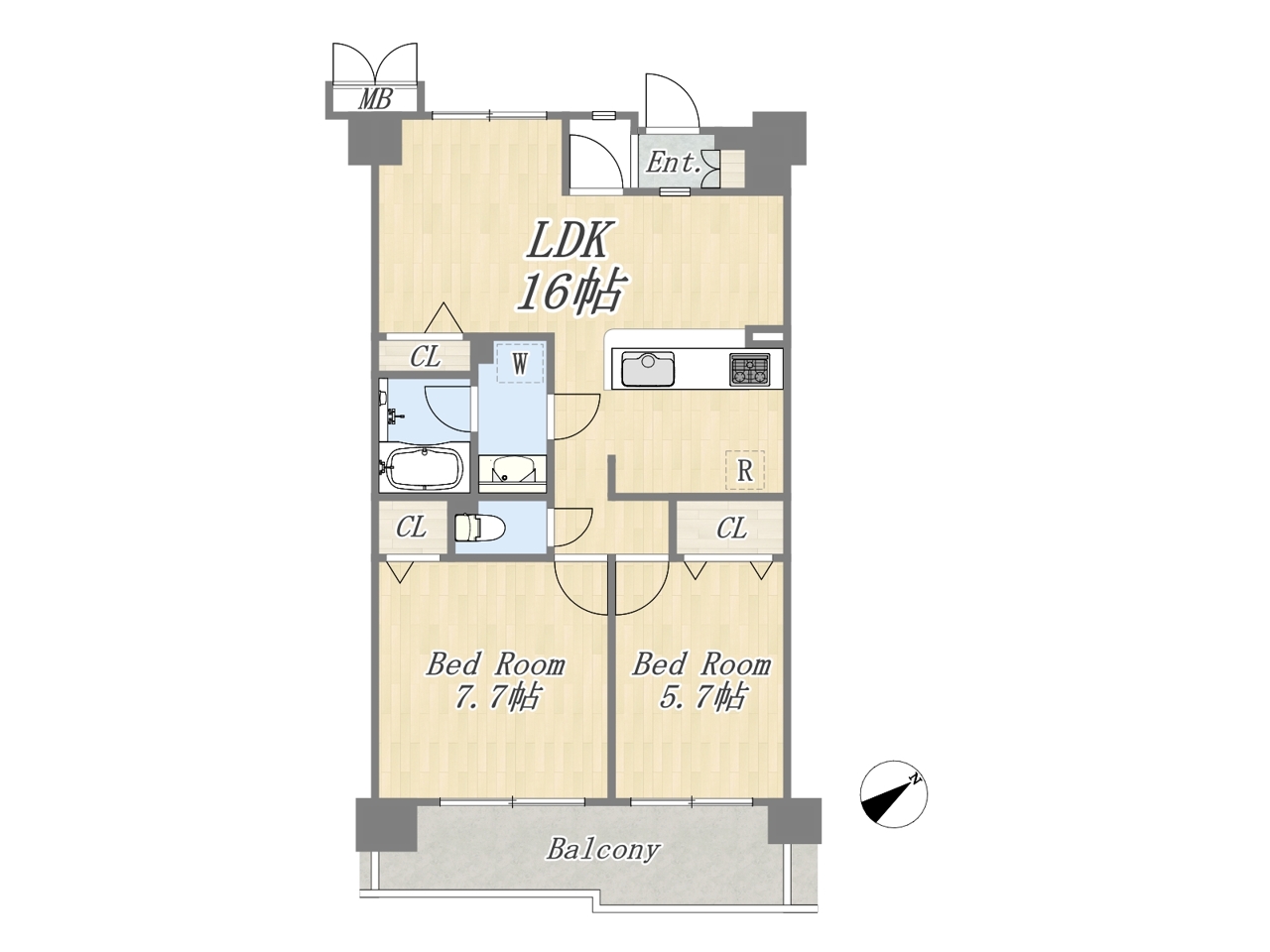 | 間取 | 2LDK (LDK16帖、洋室7.7帖、洋室5.7帖) | ||